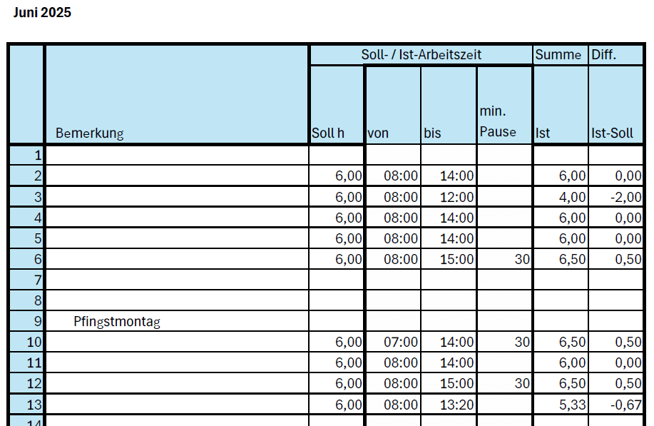 Tipp für Teilzeitkräfte: Wer flexibel arbeitet, sollte immer für sich selbst mit dokumentieren, um Klarheit zu haben, z. B. bei Gleitzeitguthaben oder Urlaubsberechnung. Eine Möglichkeit zur Zeitaufzeichnung ist z.B. eine einfache Tabelle für jeden Monat, in der die tägliche soll Arbeitszeit und die tatsächliche Arbeitszeit eingetragen werden.